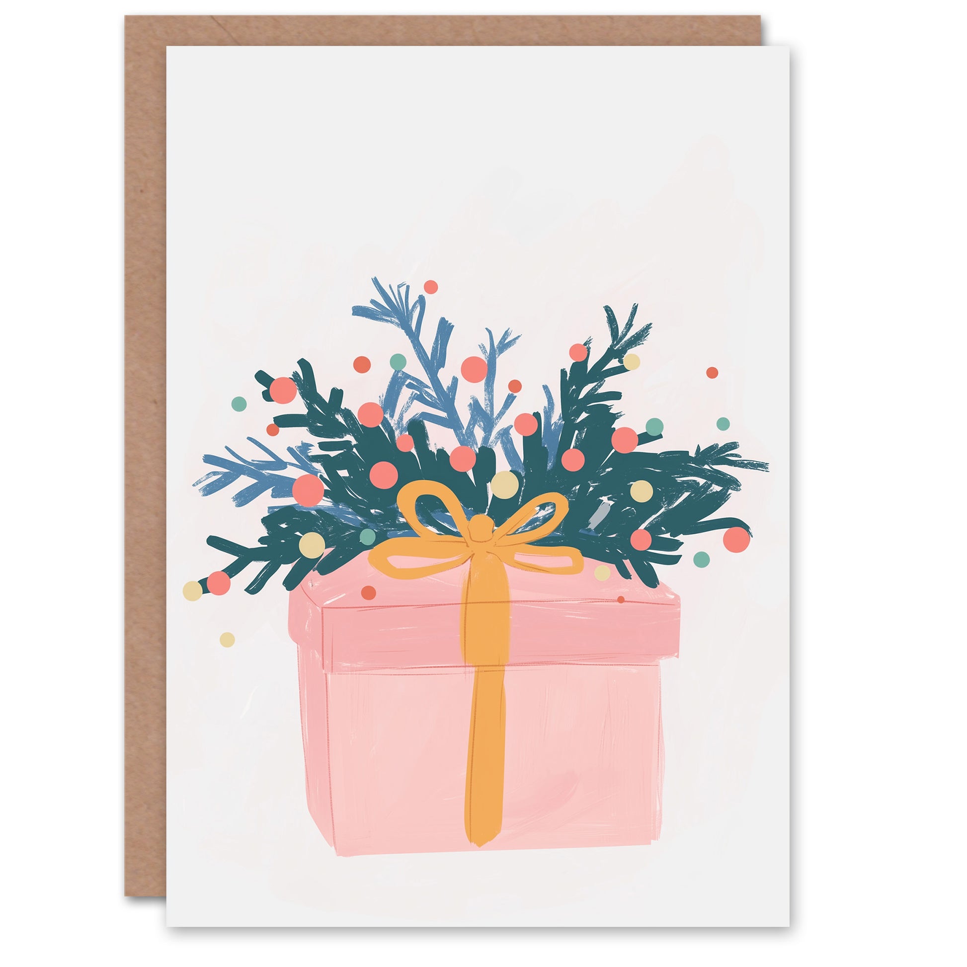 Wrapped Present Pine Berry Sprig Pastel Colour Christmas Card